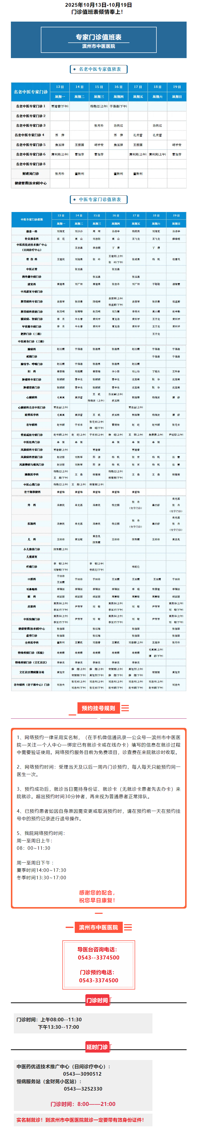 滨州市中医医院(滨州医学院附属中医医院)2025年10月13日-10月19日门诊值班表