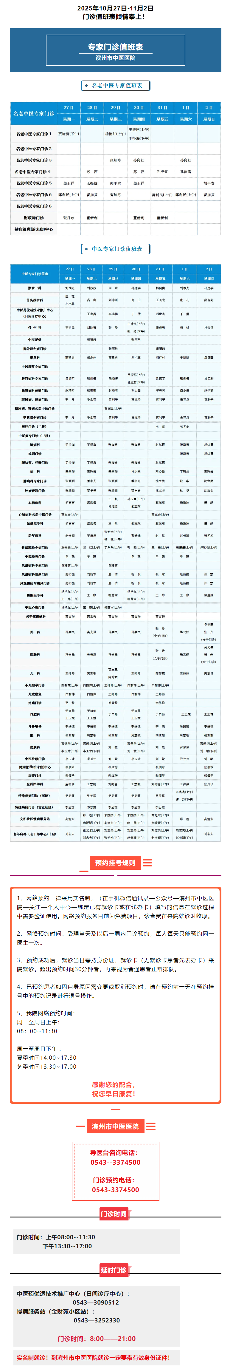 滨州市中医医院(滨州医学院附属中医医院)2025年10月27日-11月2日门诊值班表