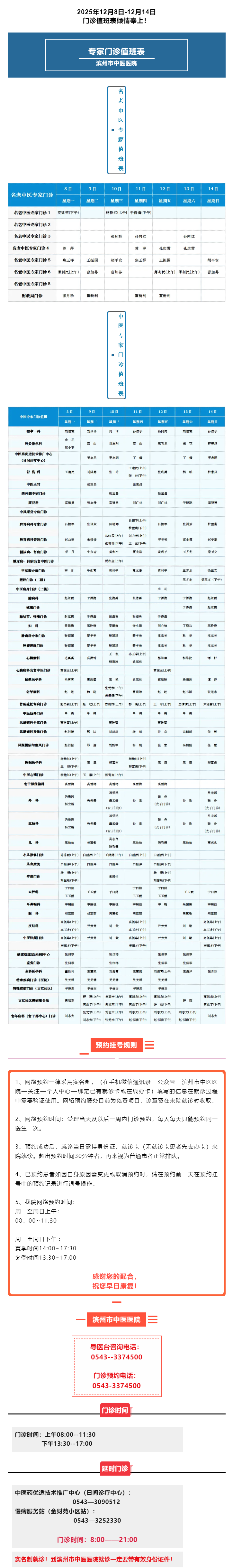 滨州市中医医院(滨州医学院附属中医医院)2025年12月8日-12月14日门诊值班表