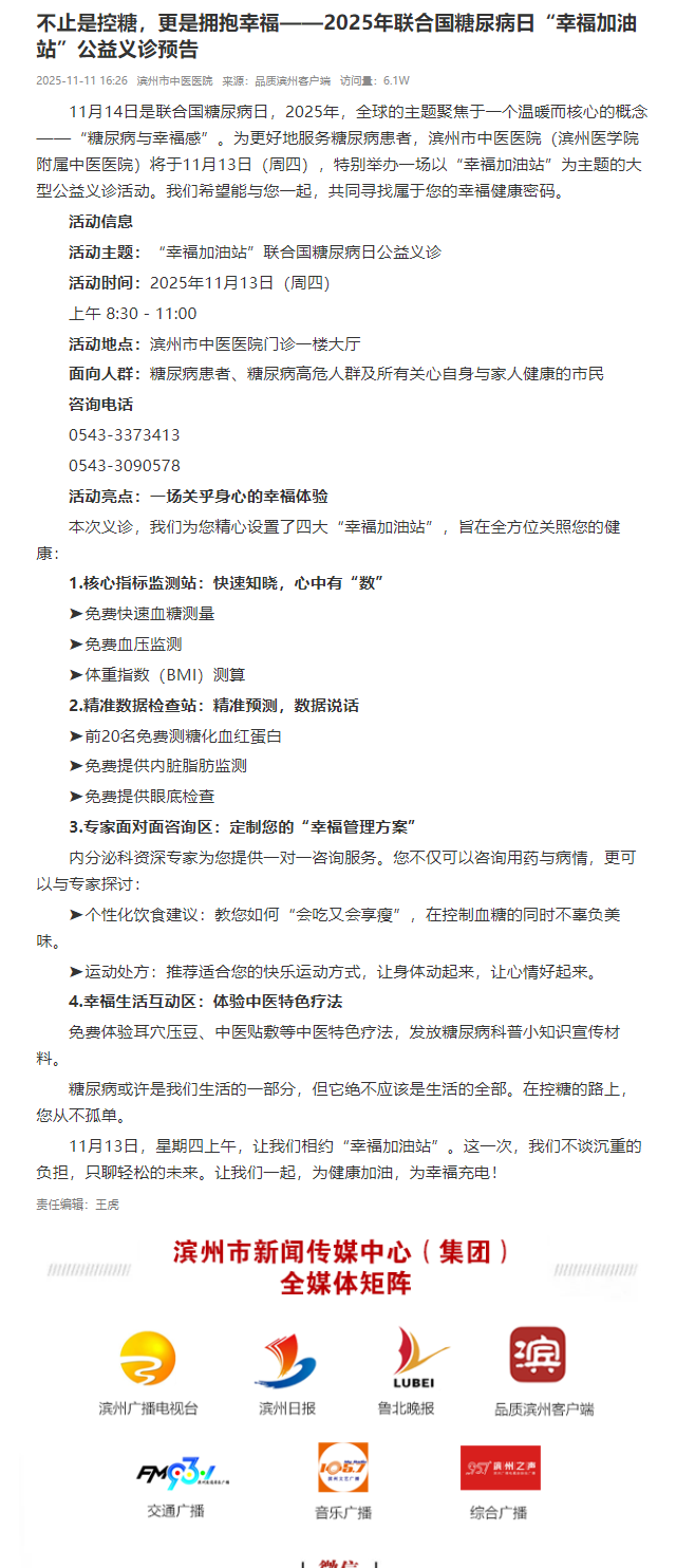 【品质滨州】不止是控糖,更是拥抱幸福——2025年联合国糖尿病日“幸福加油站”公益义诊预告