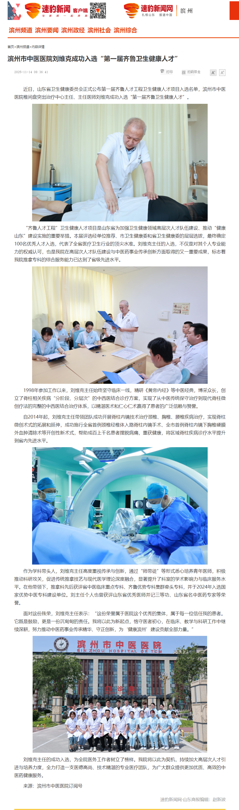 【山东商报 速豹新闻网】滨州市中医医院刘维克成功入选“第一届齐鲁卫生健康人才”