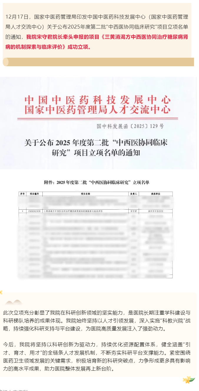 喜报 | 我院一课题喜获国家中医药管理局2025年度“中西医协同临床研究”项目立项