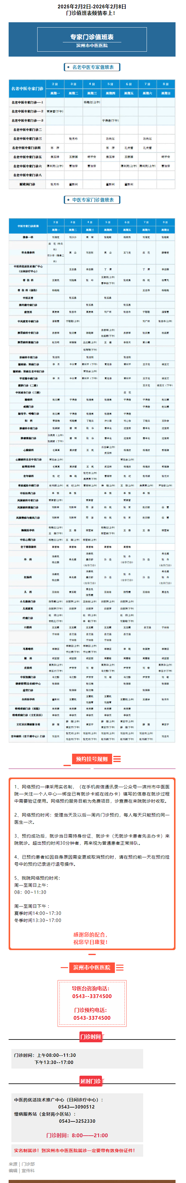 滨州市中医医院(滨州医学院附属中医医院)2025年2月2日-2026年2月8日门诊值班表