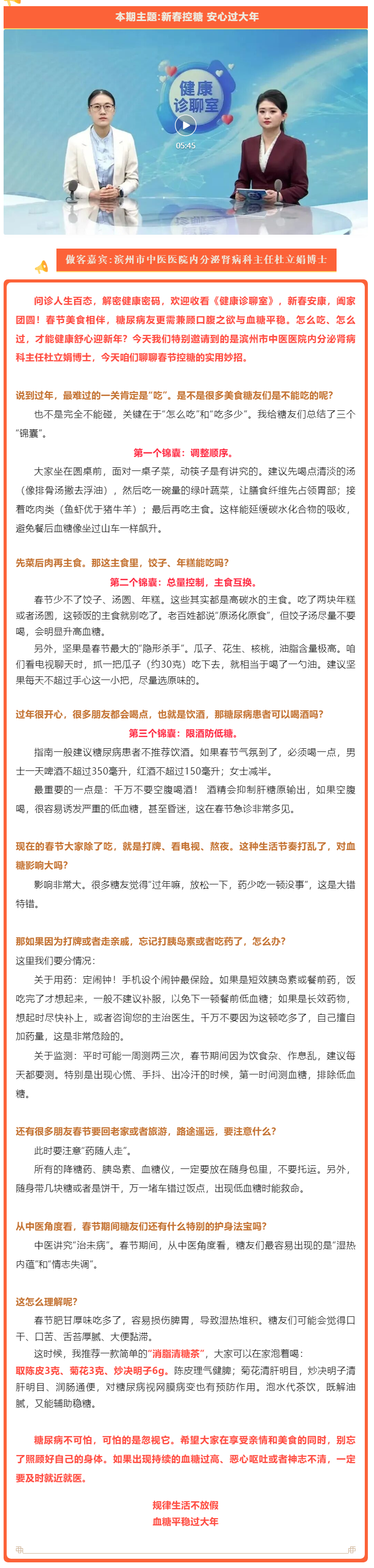 健康访谈 | 滨州市中医医院内分泌肾病科主任杜立娟博士做客《健康诊聊室》新春控糖 安心过大年