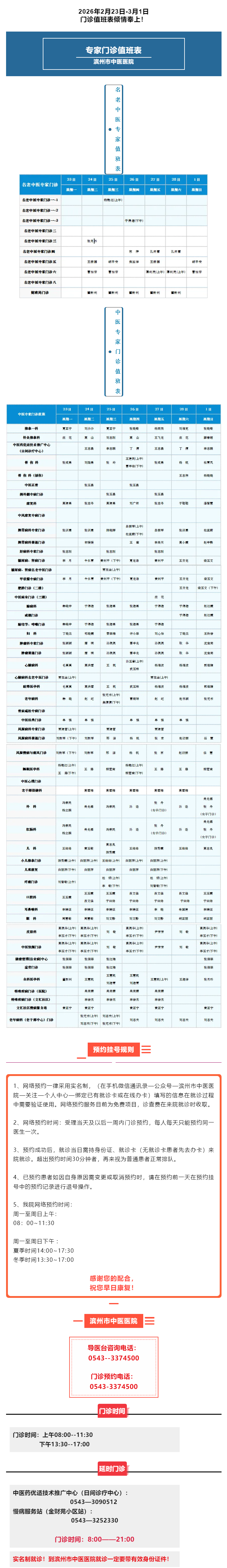 滨州市中医医院(滨州医学院附属中医医院)2026年2月23日-3月1日门诊值班表