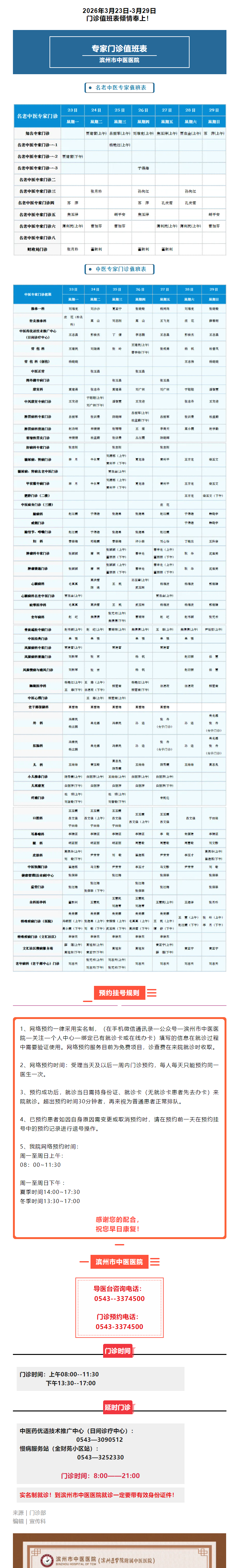 滨州市中医医院(滨州医学院附属中医医院)2026年3月23日-3月29日门诊值班表