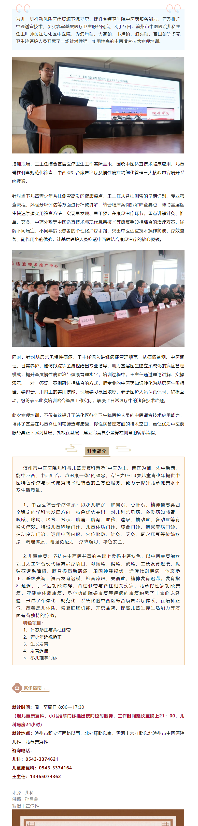 儿童脊柱侧弯中西防治有妙招——儿科王帅帅赴沾化区中医院开展中医适宜技术专项培训