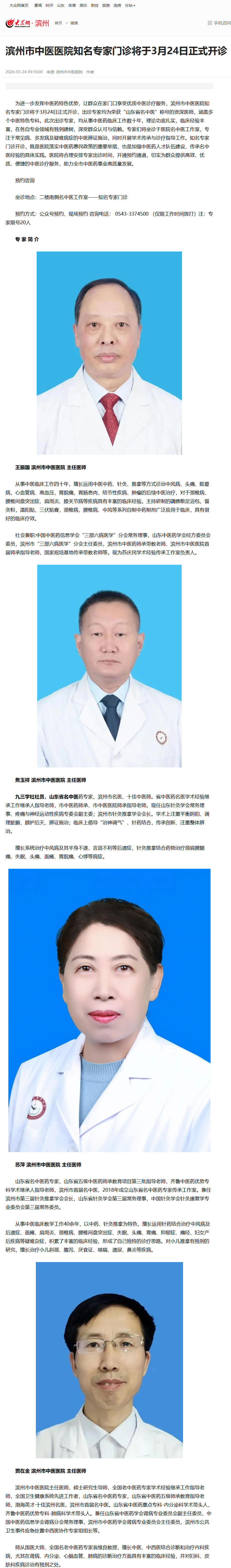 【大众网】滨州市中医医院知名专家门诊将于3月24日正式开诊