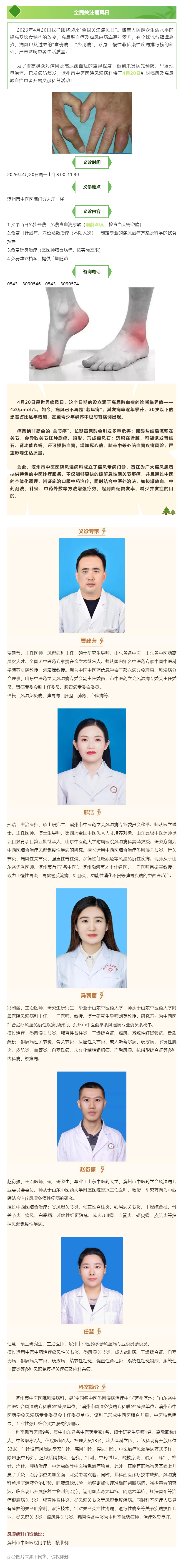 义诊预告|滨州市中医医院风湿病科将于4月20日周一“全民关注痛风日”开展义诊科普活动!